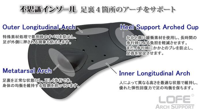 不都合な足の形からくる身体への負担を、「LOFE(ロフェ)アーチサポート」が軽減するように働きかけてくれます。